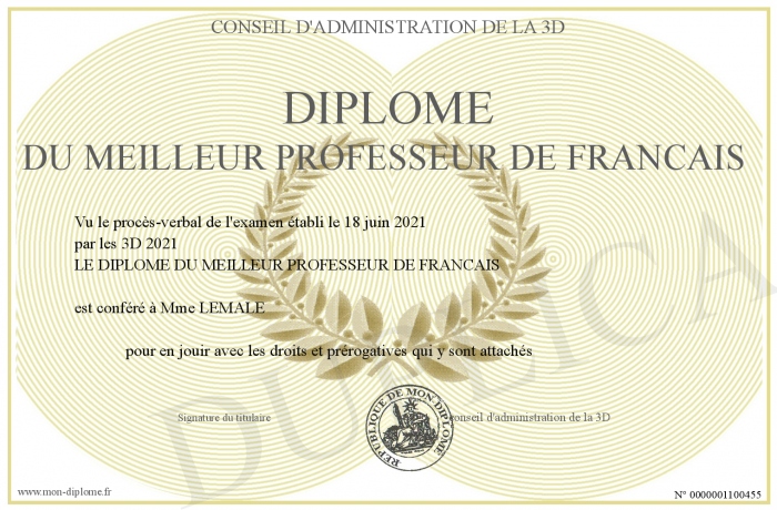 Envoyez par email votre diplôme du meilleur professeur de Francais personalisé