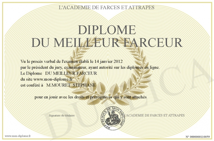 Envoyez par email votre Diplôme DU MEILLEUR FARCEUR personalisé