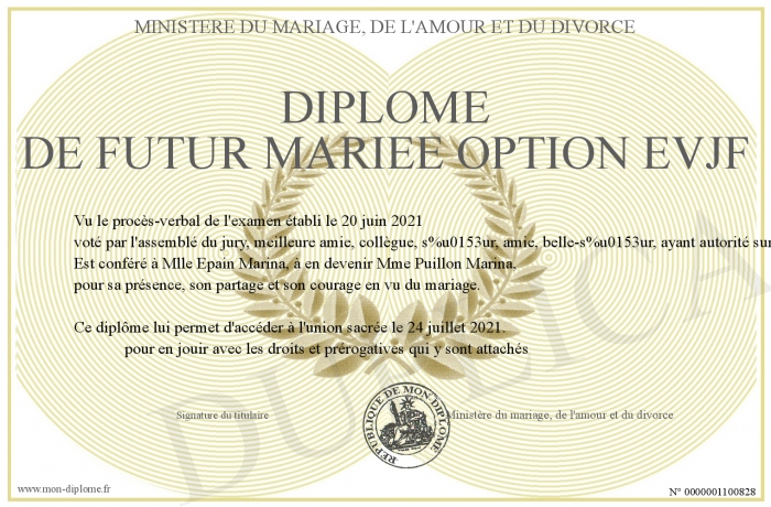 Envoyez par email votre Diplôme de futur mariée option EVJF personalisé