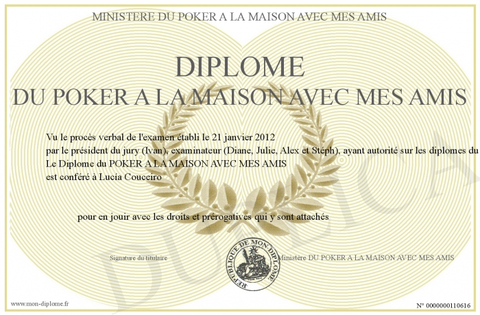 Envoyez par email votre Diplôme du POKER A LA MAISON AVEC MES AMIS personalisé