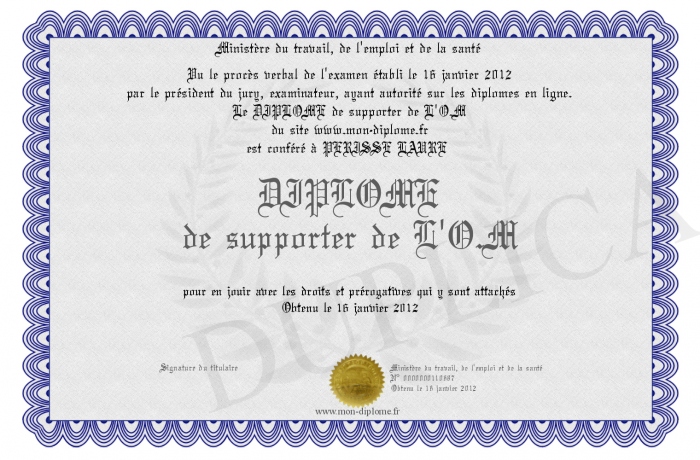 Envoyez par email votre DIPLOME de supporter de L'O.M personalisé