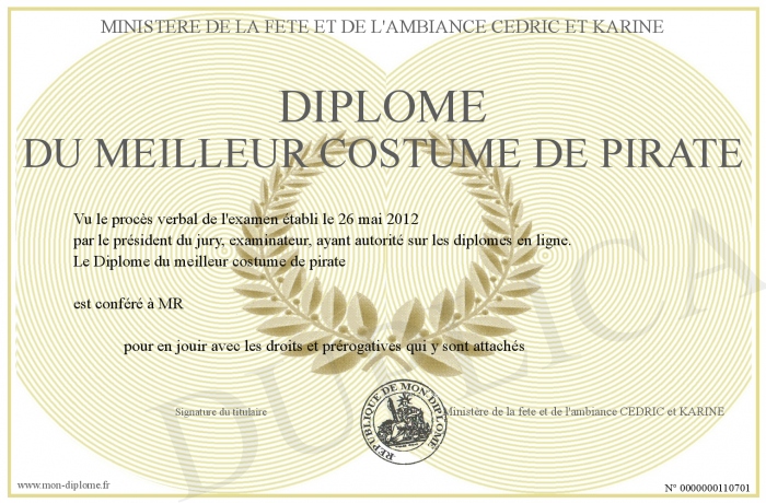 Envoyez par email votre Diplôme du meilleur costume de pirate personalisé