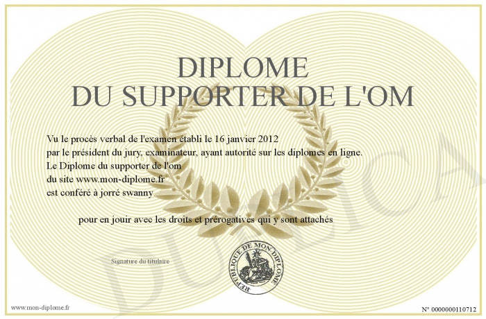 Envoyez par email votre Diplôme du supporter de l'om personalisé