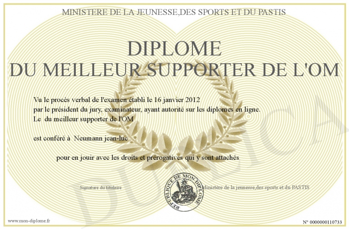 Envoyez par email votre Diplôme du meilleur supporter de l'OM personalisé