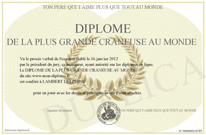 Envoyez par email votre DIPLOME DE LA PLUS GRANDE CRANEUSE AU MONDE personalisé