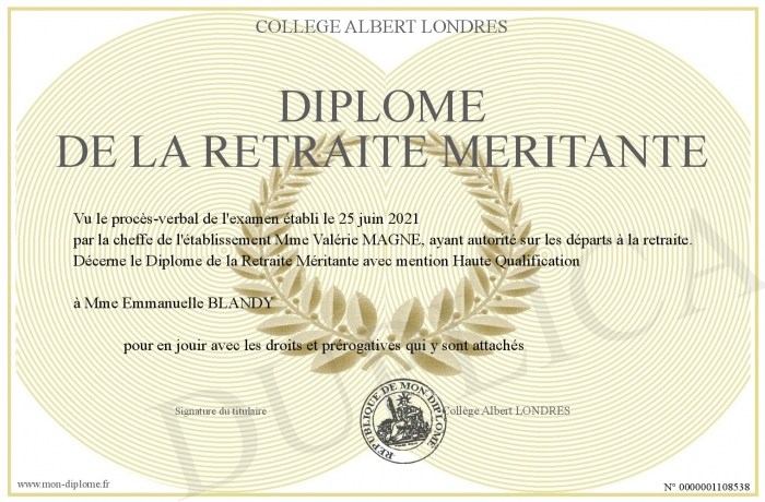 Envoyez par email votre Diplôme de la Retraite Méritante personalisé