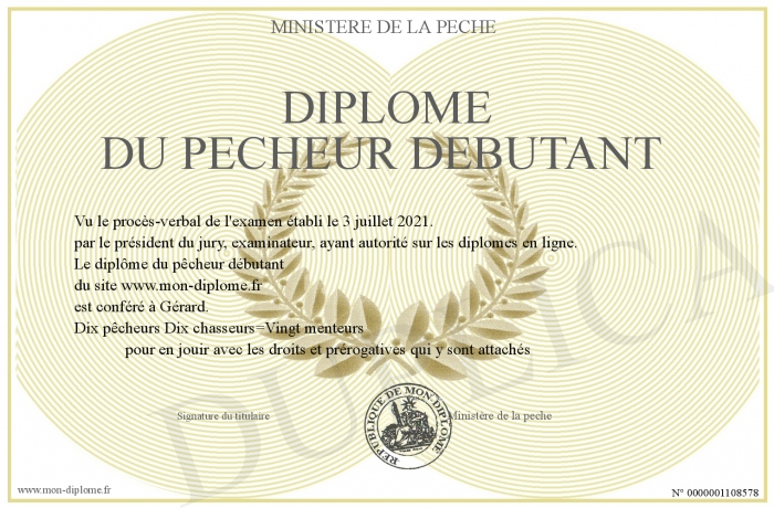 Envoyez par email votre Diplôme du pecheur débutant personalisé