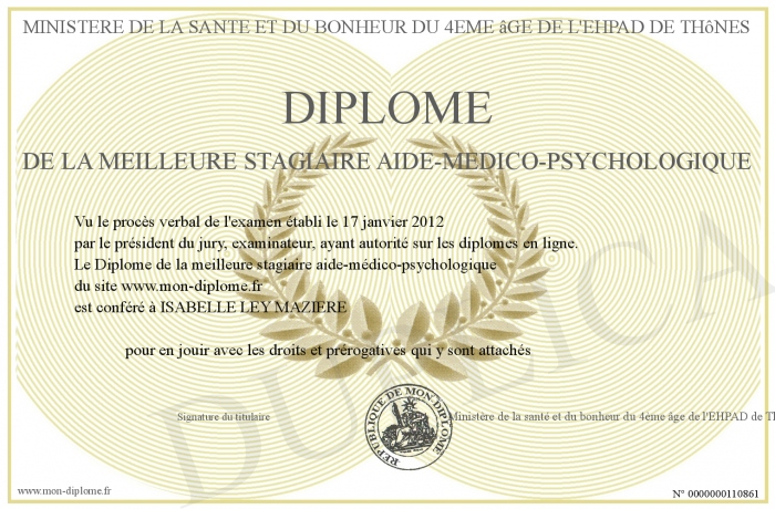 Envoyez par email votre Diplôme de la meilleure stagiaire aide-médico-psychologique personalisé