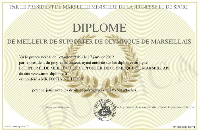 Envoyez par email votre DIPLOME DE MEILLEUR DE SUPPORTER DE OLYMPIQUE DE MARSEILLAIS personalisé