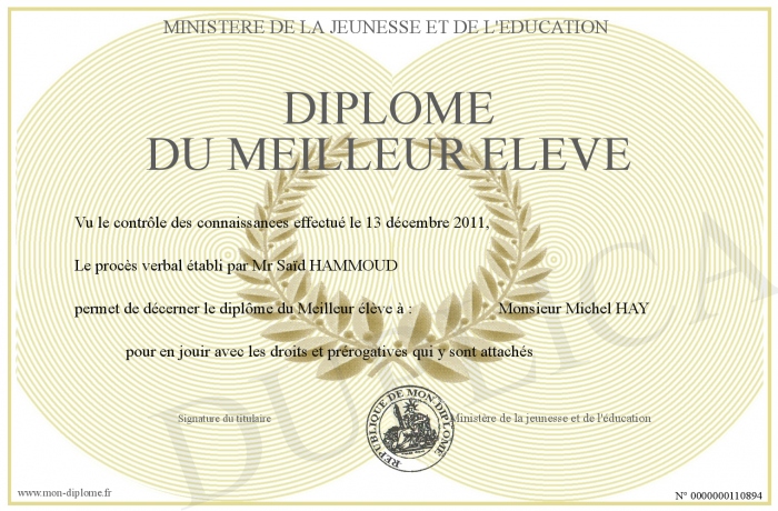 Envoyez par email votre Diplôme du meilleur élève personalisé