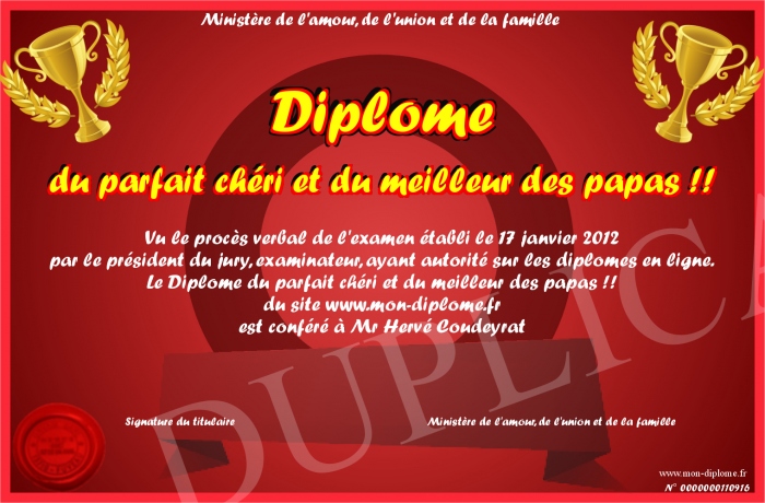 Envoyez par email votre Diplôme du parfait chéri et du meilleur des papas !! personalisé