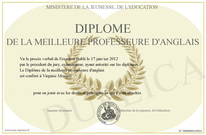 Envoyez par email votre Diplôme de la meilleure professeure d'anglais personalisé