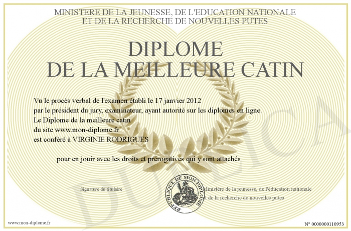 Envoyez par email votre Diplôme de la meilleure catin personalisé
