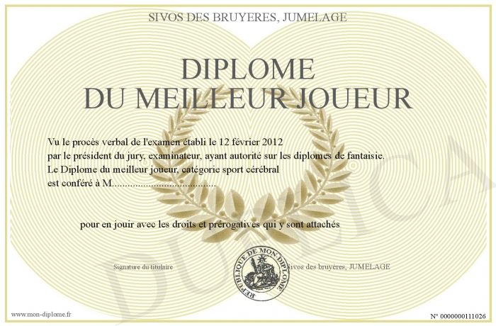 Envoyez par email votre Diplome du meilleur joueur personalisé