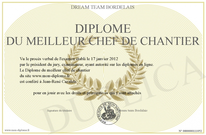 Envoyez par email votre Diplôme du meilleur chef de chantier personalisé