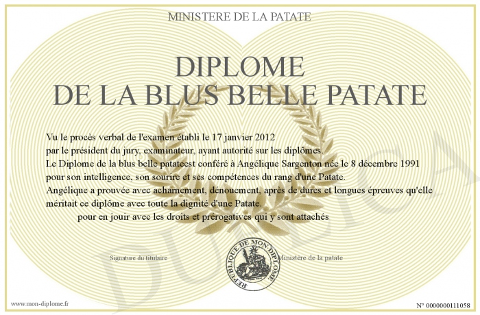Envoyez par email votre Diplôme de la blus belle patate personalisé