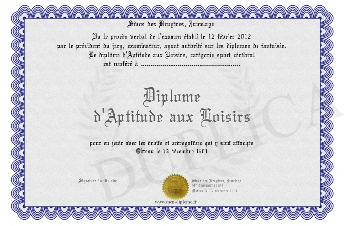 Envoyez par email votre Diplôme d'Aptitude aux Loisirs personalisé