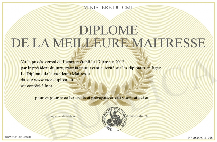 Envoyez par email votre Diplome de la meilleure Maitresse personalisé
