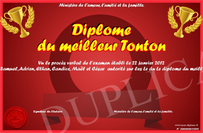 Envoyez par email votre Diplôme du meilleur Tonton personalisé