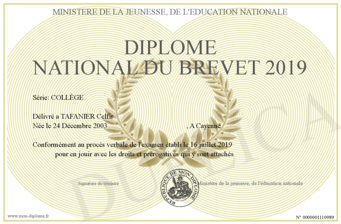 Envoyez par email votre Diplôme NATIONAL du brevet 2019 personalisé