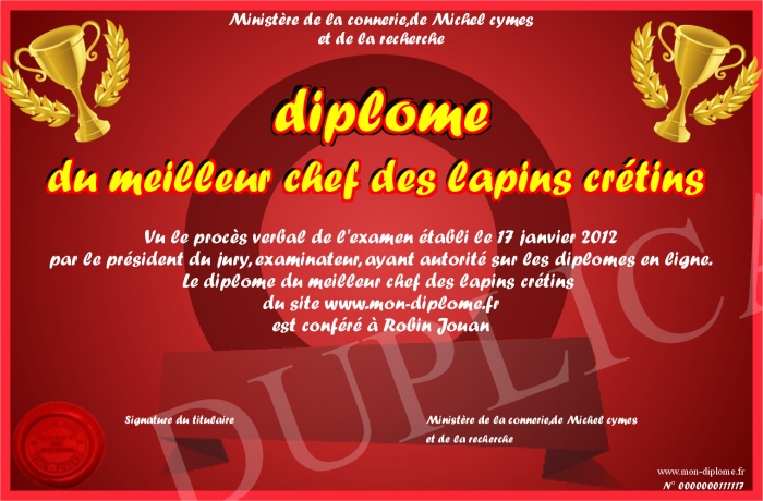 Envoyez par email votre diplôme du meilleur chef des lapins crétins personalisé