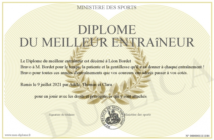 Envoyez par email votre Diplôme du meilleur entraîneur personalisé