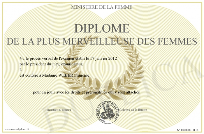Envoyez par email votre Diplôme de la plus merveilleuse des femmes personalisé