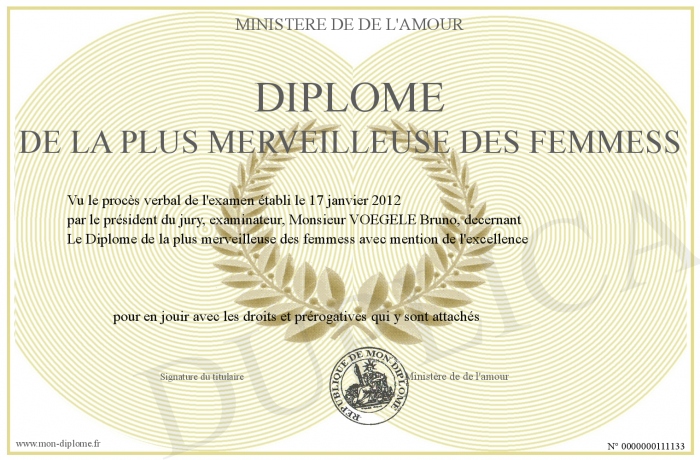 Envoyez par email votre Diplôme de la plus merveilleuse des femmess personalisé