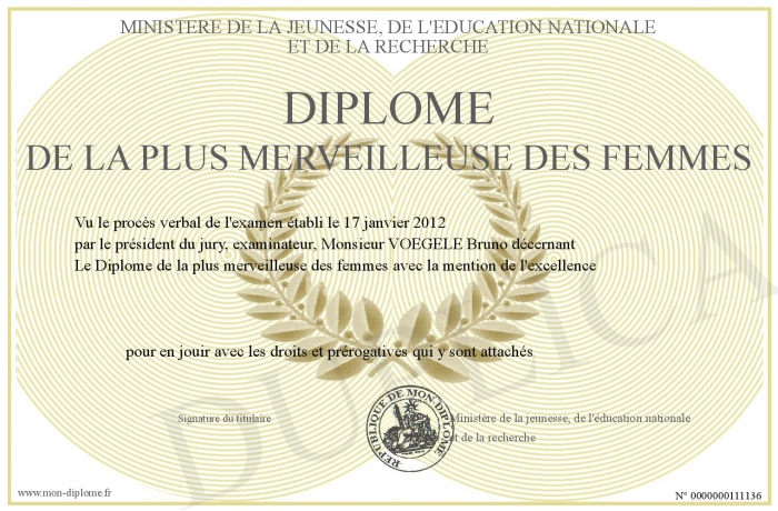 Envoyez par email votre Diplôme de la plus merveilleuse des femmes personalisé