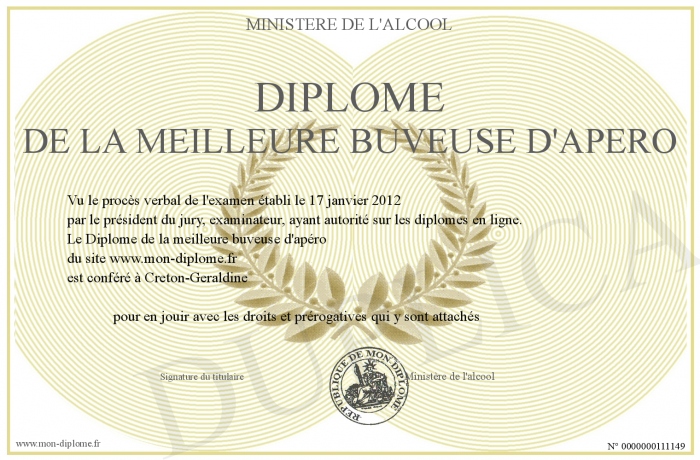 Envoyez par email votre Diplôme de la meilleure buveuse d'apéro personalisé