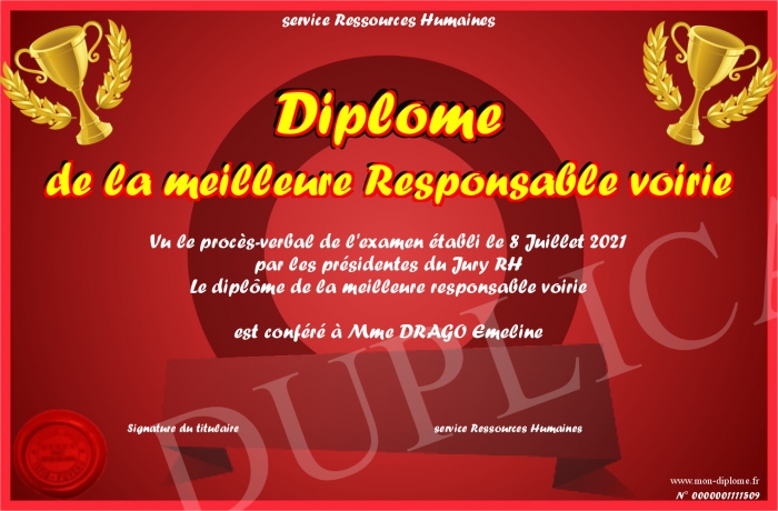 Envoyez par email votre Diplôme de la meilleure Responsable voirie personalisé