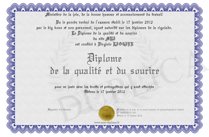 Envoyez par email votre Diplôme de la qualité et du sourire personalisé