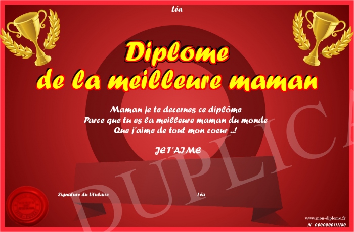Envoyez par email votre Diplôme de la meilleure maman personalisé