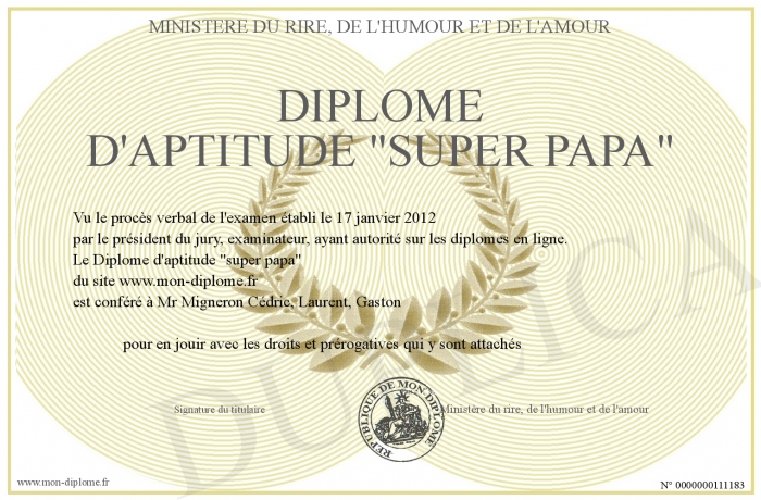Envoyez par email votre Diplome d'aptitude -super papa- personalisé