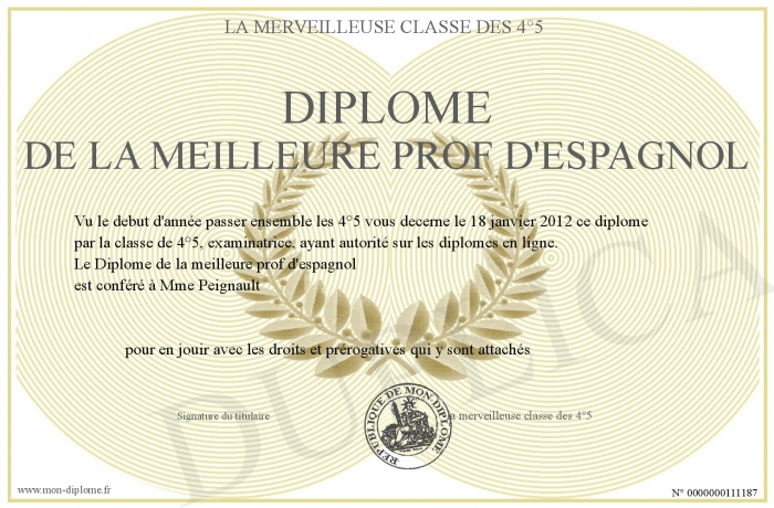 Envoyez par email votre Diplôme de la meilleure prof d'espagnol personalisé