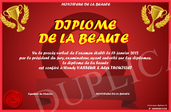 Envoyez par email votre DIPLOME DE LA BEAUTE personalisé