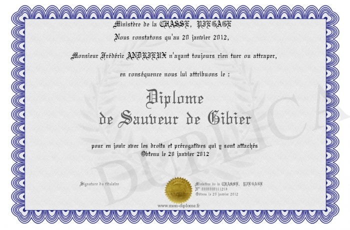 Envoyez par email votre Diplôme de Sauveur de Gibier personalisé