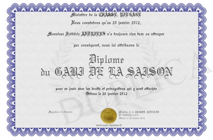 Envoyez par email votre Diplôme du GABI DE LA SAISON personalisé