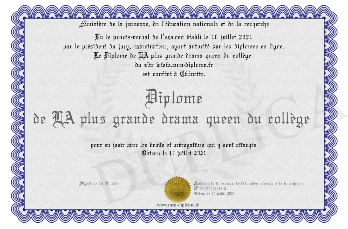 Envoyez par email votre Diplôme de LA plus grande drama queen du collège personalisé