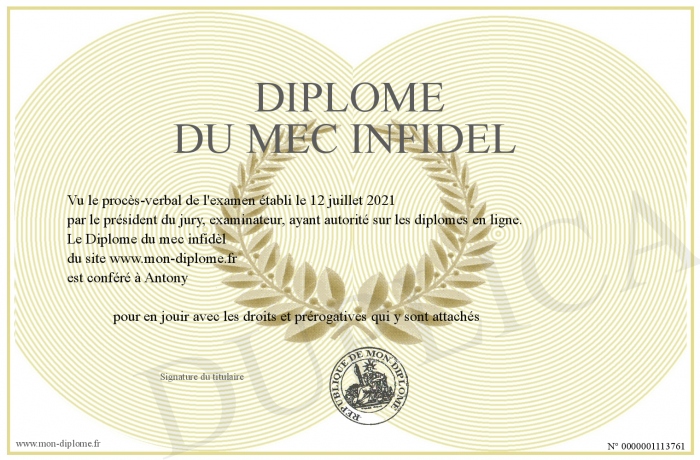 Envoyez par email votre Diplôme du mec infidèl personalisé