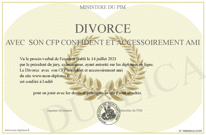 Envoyez par email votre Divorce avec son CFP confident et accessoirement ami personalisé