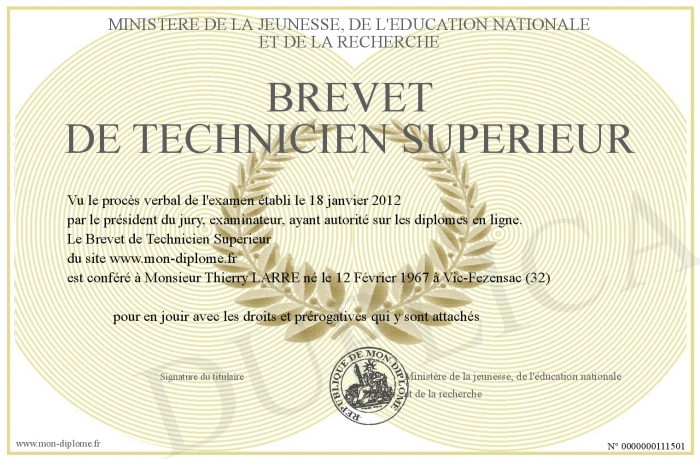 Envoyez par email votre Brevet de Technicien Superieur personalisé