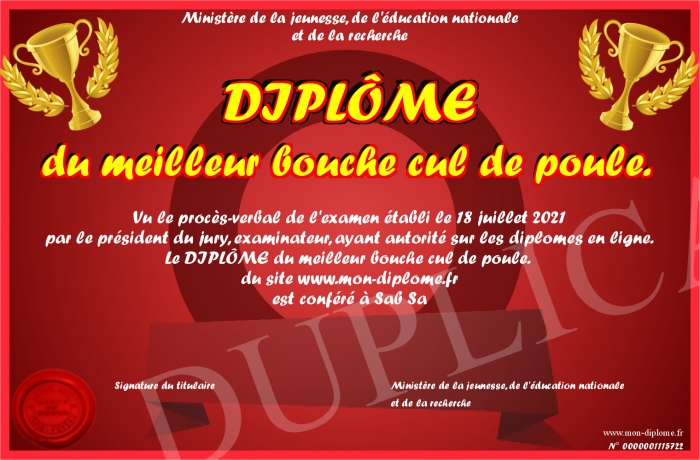 Envoyez par email votre DIPLÔME du meilleur bouche cul de poule. personalisé
