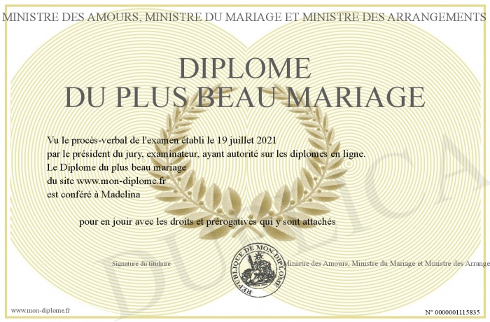 Envoyez par email votre Diplôme du plus beau mariage personalisé