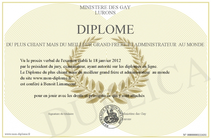 Envoyez par email votre Diplôme du plus chiant mais du meilleur grand frère et administrateur au monde personalisé