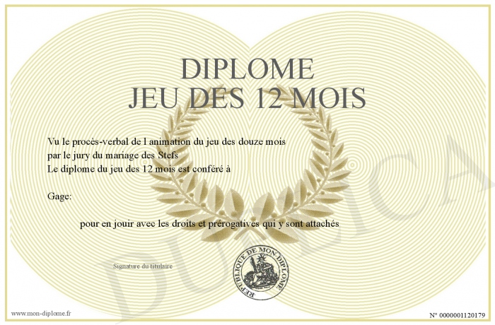 Envoyez par email votre Diplôme jeu des 12 mois personalisé