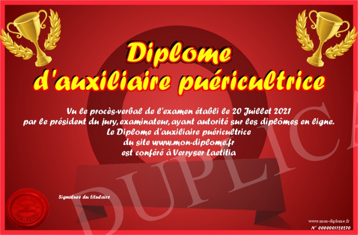 Envoyez par email votre Diplôme d'auxiliaire puéricultrice personalisé