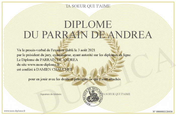 Envoyez par email votre Diplôme du PARRAIN DE ANDREA personalisé