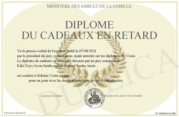 Envoyez par email votre Diplôme du cadeaux en retard personalisé