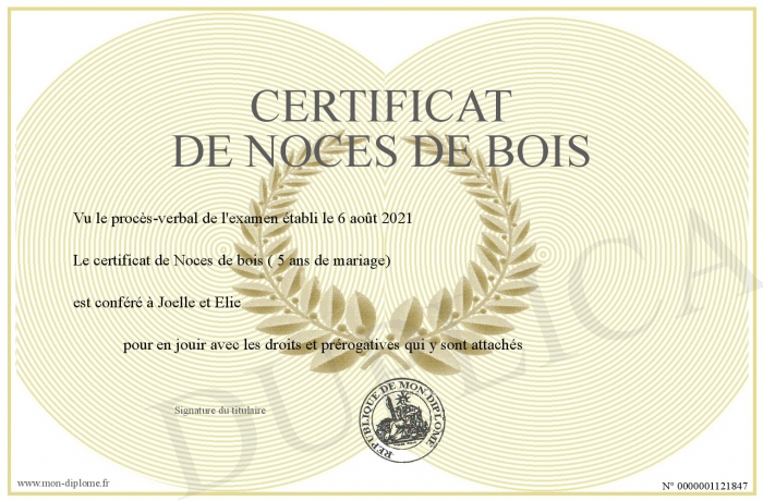 Envoyez par email votre CERTIFICAT DE NOCES DE BOIS personalisé